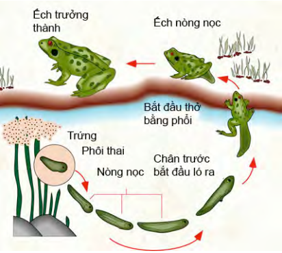 Vòng đời của ếch chia làm bốn giai đoạn: Trứng - Nòng nọc - Ếch con - Ếch trưởng thành.