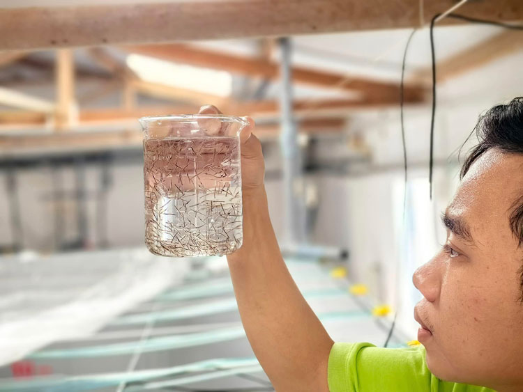 Cách tạo biofloc: Dùng nguồn carbon từ mật rỉ đường có hàm lượng C là 46,7% để tạo biofloc. Mật rỉ đường hòa với nước 15‰ rồi ủ 24 giờ với vi sinh SUPER EM.S với lượng 1 g/m3 (Vi sinh có thành phần: Bacillus subtilis (2×105 CFU/kg), Lactobacillus acidophilus (2×105 CFU/kg), Saccharomy cescerevisiae (2×105 CFU/kg), Nitrosomonas sp. (2×105 CFU/kg), Nitrobacter sp. (2×104 CFU/kg), chất mang vừa đủ 1 kg), sau đó bổ sung trực tiếp vào bể ương. Tùy vào lượng thức ăn nhân tạo sử dụng cho tôm mà lượng mật rỉ đường được thêm vào để đạt tỷ lệ C:N = 10:1 (Chau et al., 2019). Mật rỉ đường được bổ sung 1 ngày/lần vào lúc 14:30 với hàm lượng cần bổ sung vào bể để tạo biofloc được tính dựa trên công thức của Avnimelech (2015).