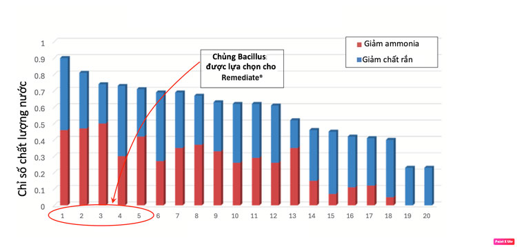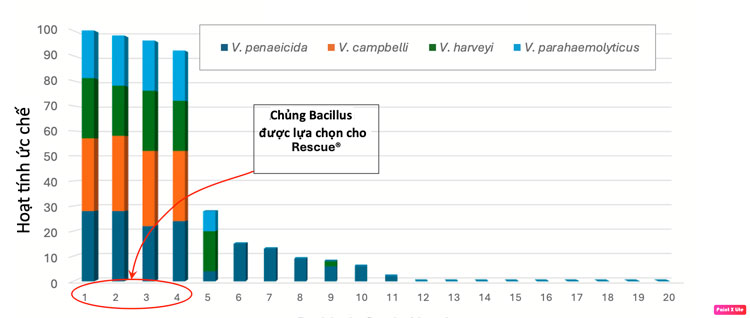 Zeigler đã thử nghiệm 21 chủng Bacillus về khả năng ức chế bốn chủng Vibrio gây bệnh (Hình 1) và chọn ra bốn chủng hiệu quả nhất để phát triển sản phẩm probiotic Rescue. Tương tự, nhiều chủng Bacillus cũng được sàng lọc về khả năng giảm amonia và phân hủy chất hữu cơ (Hình 2), với năm chủng được chọn cho sản phẩm probiotic Remediate. Quy trình chọn lọc mục tiêu này giúp đảm bảo hiệu quả tối ưu cho từng mục đích sử dụng.